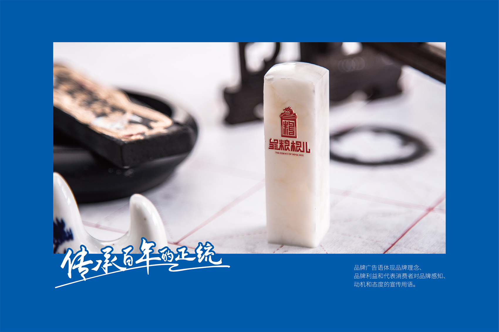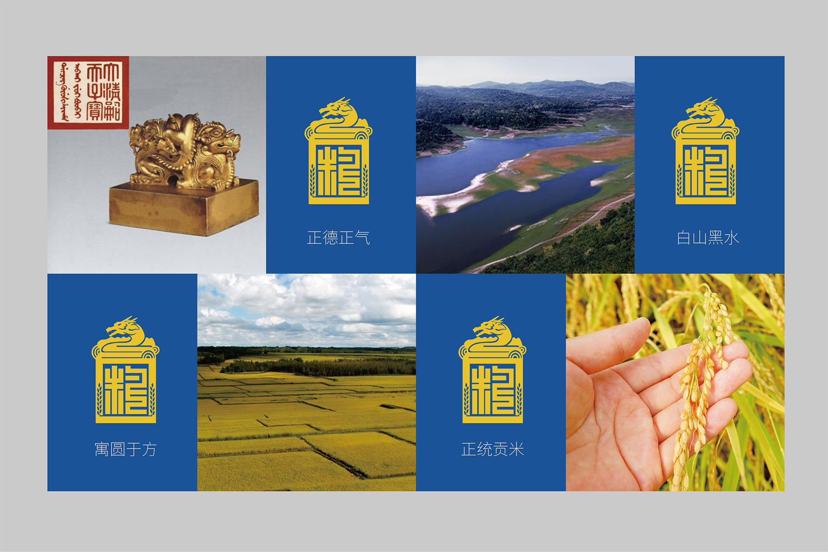 以兼顧理解與傳播度的slogan——傳承百年的正統(tǒng)成為了皇糧根兒不斷堅守與傳承的最好注解?;始Z根兒大米的logo采用了玉璽的形象來傳遞200年的皇室貢米內(nèi)涵,其中的環(huán)繞其中的白山黑水象征著滿族的龍興之地,原創(chuàng)設計字體采用了乾隆年間玉璽篆字字體風格,將皇糧根三字都融為一體,整體可以視作“糧”字,配合兩旁的水稻紋樣點明了行業(yè)屬性,端莊大氣,頗具皇家風范,在具有設計感的同時,能夠將皇糧根=正統(tǒng)貢米的品牌印象植入消費者心智。
