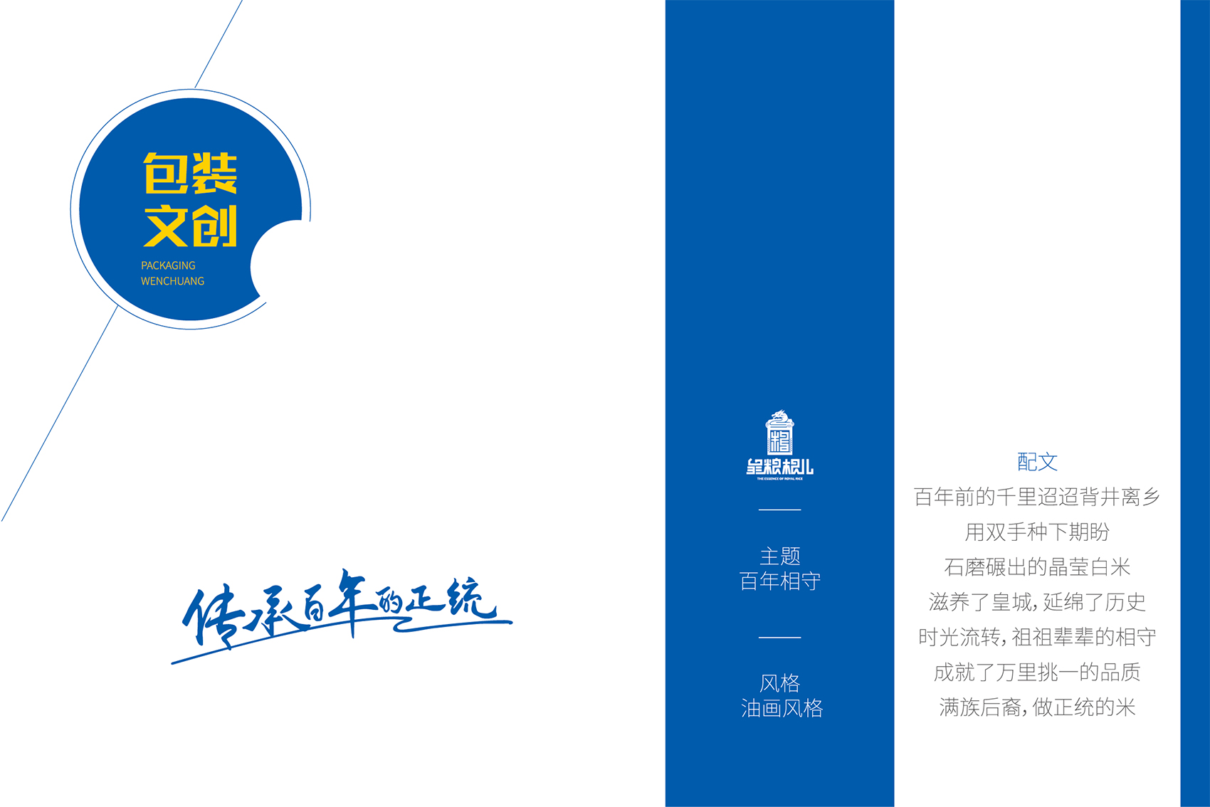 針對皇糧根兒大米中的高端產(chǎn)品——有機大米,繽策團隊在進行市場調(diào)研,查閱大量資料后發(fā)現(xiàn)電商市場中有機產(chǎn)品包裝多數(shù)以紅色與綠色為主,紅色對于中國民族具有獨有的心理印記,代表著吉祥喜慶,節(jié)日的歡樂,綠色則代表自然與生態(tài),在視覺層面上大多數(shù)都趨于同化,無法留下獨特的品牌印象。在確定品牌文化后,在延續(xù)傳承滿族百年正統(tǒng)貢米的主題下,繽策團隊在如何表現(xiàn)滿族傳統(tǒng)方面進行了大量的資料收集整理與研究,發(fā)現(xiàn)代表滿族皇室的顏色正是有機大米品類中幾乎沒有的藍色,這種差異化的顏色本身就能夠起到超級符號的作用;在內(nèi)容方面則選取了與品牌logo相同結構的龍與皇城組合而成的元素,一方面呼應logo,另一方面不斷加強皇糧根兒的品牌印象,形成聯(lián)動效應。