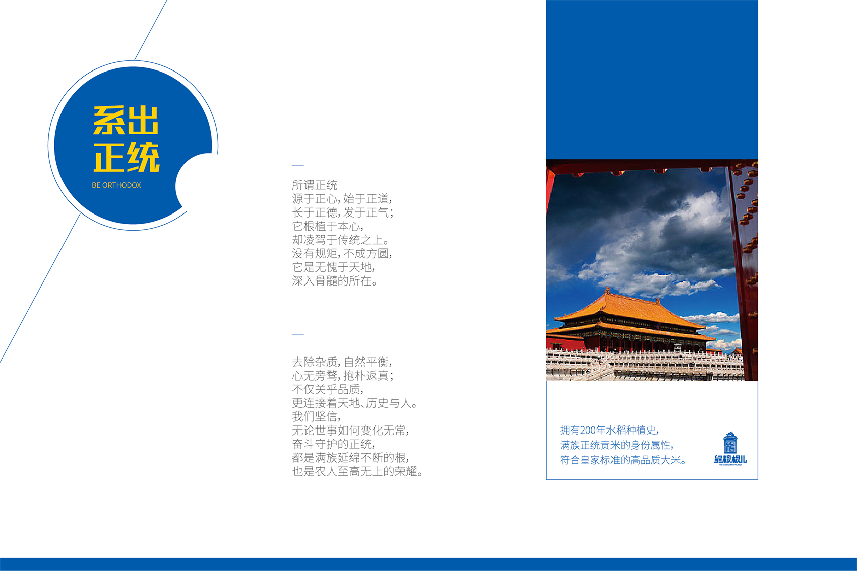 作為品牌的核心競爭力,品牌文化需要彰顯產(chǎn)品自身的特點和與眾不同的差異化存在,結合創(chuàng)始人的發(fā)心與愿景,創(chuàng)造出具有獨特價值的文化系統(tǒng)。繽策團隊在與企業(yè)座談中了解到五常市營城子滿族鄉(xiāng)自唐興起,清代正始,歷經(jīng)200個春夏秋冬,世代種植貢米的悠久歷史,是品牌所具備的獨一無二的天然優(yōu)勢,同時也是產(chǎn)品品質(zhì)值得信賴的根源所在。這使得皇糧根兒有機大米采用滿族傳統(tǒng)種植方式,進行有機種植,杜絕農(nóng)藥化肥,傳統(tǒng)的生物除蟲人工除草,精耕細作保證產(chǎn)品品質(zhì)。這也成為了皇糧根兒品牌文化的出發(fā)點與落腳點。