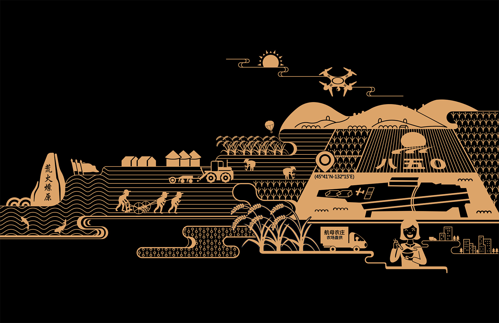 超級品牌源于超級創(chuàng)意,而超級創(chuàng)意就是一個深入人心的超級符號。所以品牌要么始于符號,要么成為符號,通常兩者都是。繽策團隊在與企業(yè)座談中了解到有關八五零農場的軍墾歷史,以及產品本身的特點——使用蚯蚓有機肥進行灌溉培育,在得天獨厚的自然條件與有機肥料的雙重作用下,自然讓蚯蚓米擁有更好的品質,在繽策團隊的頭腦風暴下,將八五零農場的自然面貌與當?shù)氐貥诵越ㄖ嗷ト诤?,使用扁平化插畫將品牌核心價值——農場直供,以視覺化策方式呈現(xiàn)出來,簡約流暢,豐而不亂,同時也向消費者傳遞出從種植到收割,從加工到運輸?shù)娜^程。