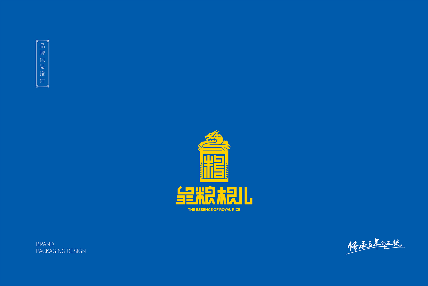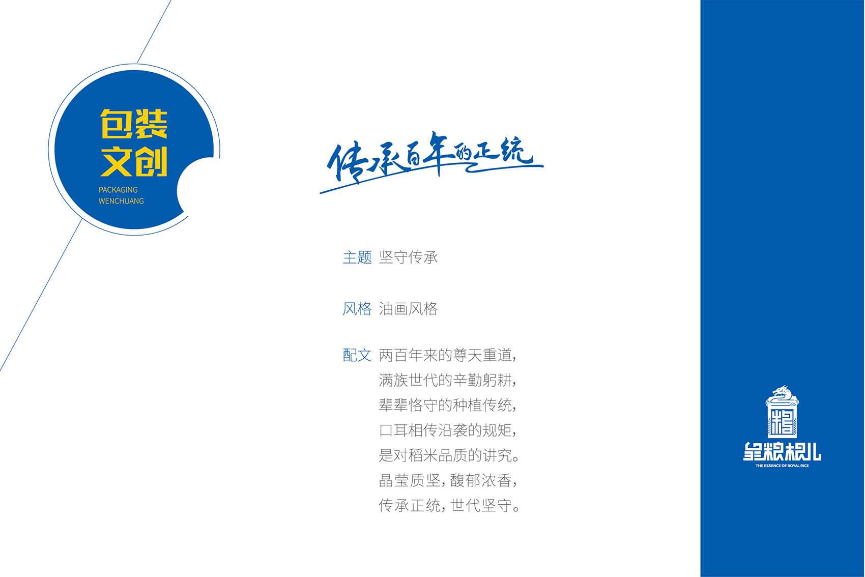 以兼顧理解與傳播度的slogan——傳承百年的正統(tǒng)成為了皇糧根兒不斷堅守與傳承的最好注解?;始Z根兒大米的logo采用了玉璽的形象來傳遞200年的皇室貢米內(nèi)涵,其中的環(huán)繞其中的白山黑水象征著滿族的龍興之地,原創(chuàng)設計字體采用了乾隆年間玉璽篆字字體風格,將皇糧根三字都融為一體,整體可以視作“糧”字,配合兩旁的水稻紋樣點明了行業(yè)屬性,端莊大氣,頗具皇家風范,在具有設計感的同時,能夠將皇糧根=正統(tǒng)貢米的品牌印象植入消費者心智。