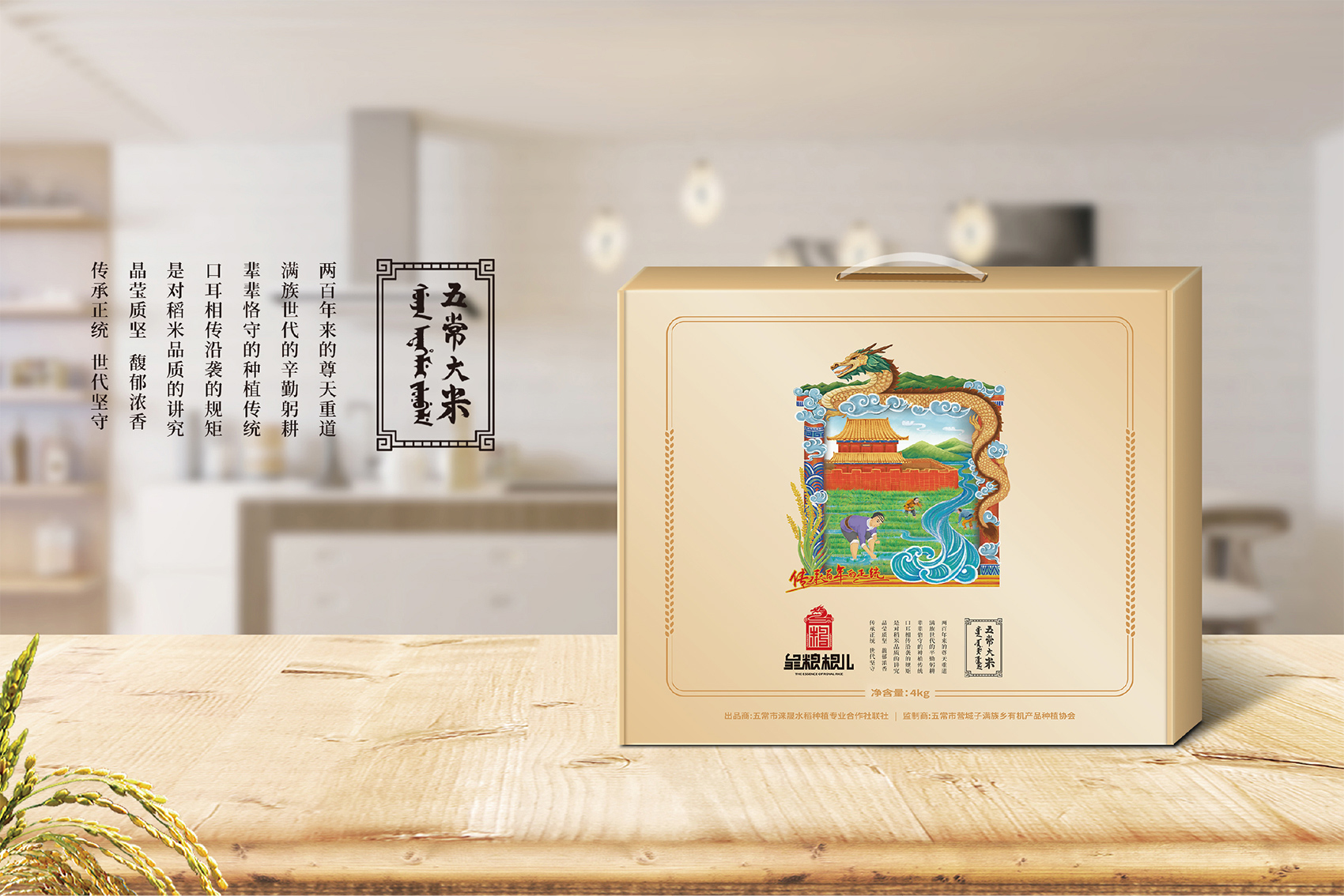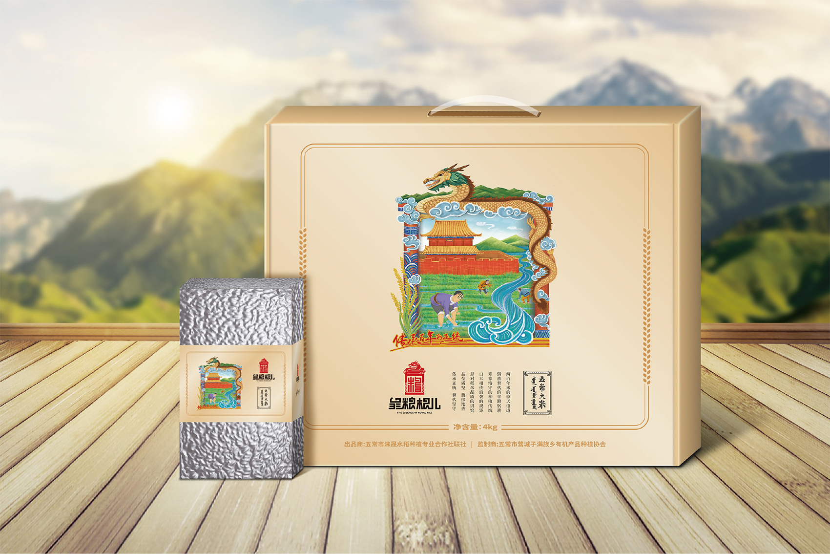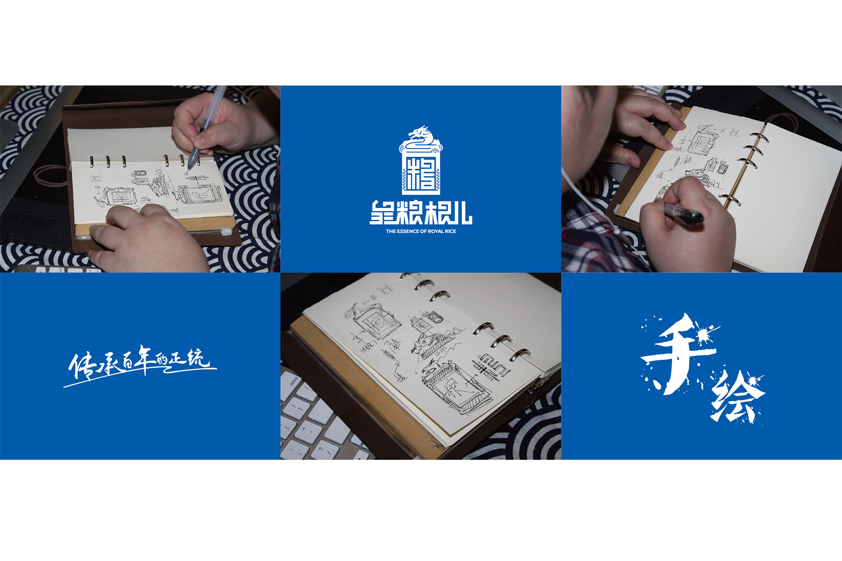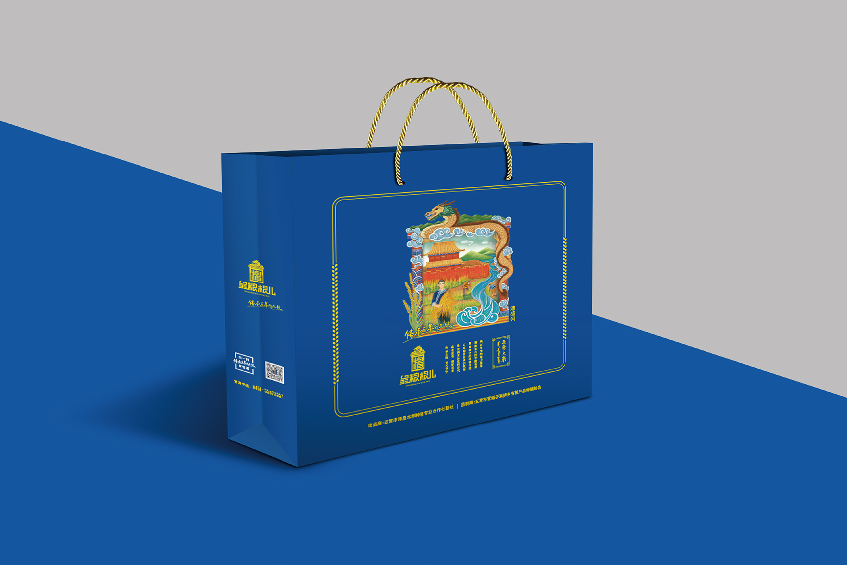 針對皇糧根兒大米中的高端產(chǎn)品——有機大米,繽策團隊在進行市場調(diào)研,查閱大量資料后發(fā)現(xiàn)電商市場中有機產(chǎn)品包裝多數(shù)以紅色與綠色為主,紅色對于中國民族具有獨有的心理印記,代表著吉祥喜慶,節(jié)日的歡樂,綠色則代表自然與生態(tài),在視覺層面上大多數(shù)都趨于同化,無法留下獨特的品牌印象。在確定品牌文化后,在延續(xù)傳承滿族百年正統(tǒng)貢米的主題下,繽策團隊在如何表現(xiàn)滿族傳統(tǒng)方面進行了大量的資料收集整理與研究,發(fā)現(xiàn)代表滿族皇室的顏色正是有機大米品類中幾乎沒有的藍色,這種差異化的顏色本身就能夠起到超級符號的作用;在內(nèi)容方面則選取了與品牌logo相同結構的龍與皇城組合而成的元素,一方面呼應logo,另一方面不斷加強皇糧根兒的品牌印象,形成聯(lián)動效應。