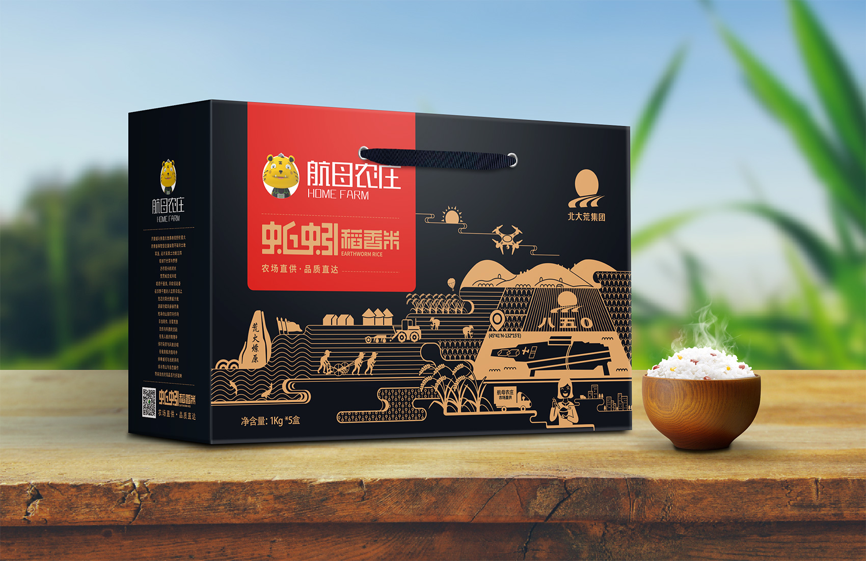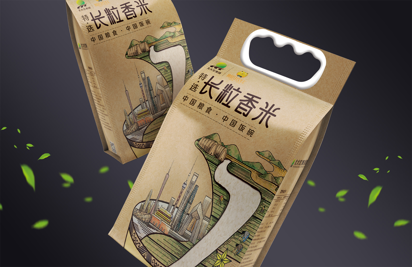 長粒香種植區(qū)位于七星農場,在習近平總書記考察后發(fā)表了著名的中國飯碗中國糧的講話,“北大荒為中國人真正解決溫飽問題發(fā)揮了大作用,我們一定要保護好黑土地,保護好中國飯碗。中國人要把飯碗端在自己手里,而且要裝自己的糧食?!崩_策采用類版畫風格的插畫來表現(xiàn)從農場直接到飯碗中的品牌核心價值,優(yōu)質的綠水青山自然環(huán)境之下生產出高品質好滋味的長粒香,中間的鏤空部分既象征著產品的產地——七星農場,也象征著運送產品的廣闊道路,形成令人記憶深刻的超級符號;在碗中的地標性建筑物代表全國各地,寓意企業(yè)寬廣美好的未來;整體包材采用環(huán)保牛皮紙,在提升了質感與手感的同時,也能在同質化的包裝中脫穎而出。