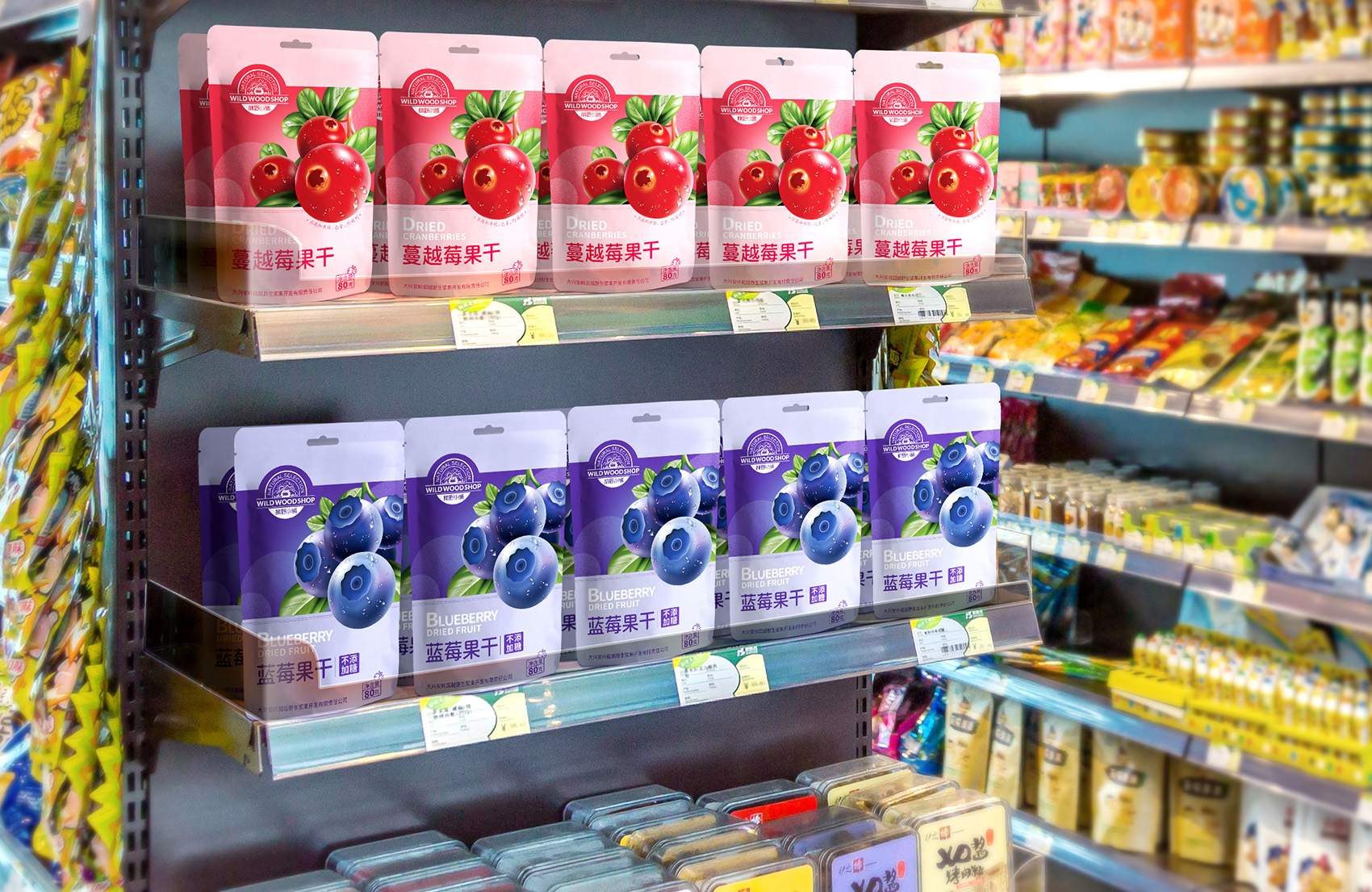 過詳盡的線上與線下調研,繽策發(fā)現莓類果干細分市場下,主流產品包裝以商業(yè)攝影為主,以實物來引發(fā)消費者聯(lián)想,以食欲策略促進購買。但由于同質化因素影響,很難讓消費者區(qū)別品牌之間的差異,消費者自然走向了價格傾向,所以與眾不同并凸顯品牌的存在是現階段幫助林野小屋脫穎而出的關鍵。繽策將插畫植入其中,以逼真的寫實3D風格展示品牌的獨一無二,在美觀的同時,讓人也能記住品牌,清晰簡潔的版式重點突出,讓人賞心悅目,幫助品牌凸顯產品的品質與格調,便于推廣與傳播。